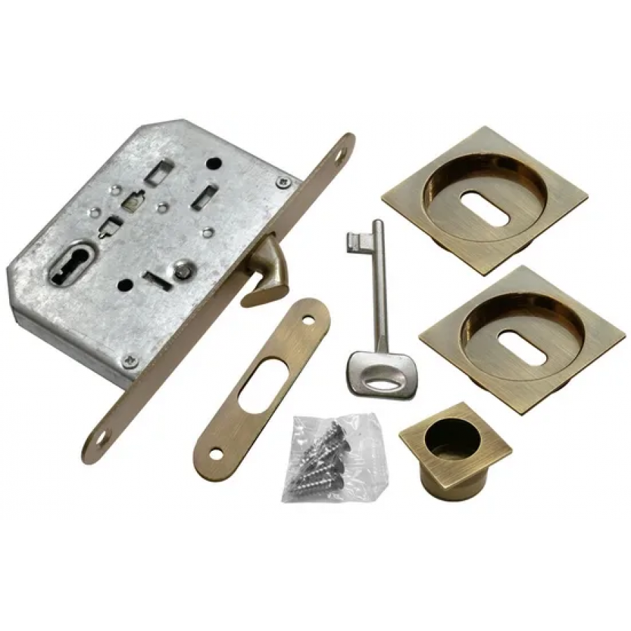 Комплект фурнитуры для раздвижных дверей с замком создан для фиксации раздвижного полотна двери в закрытом состоянии, для чего стандартный ригель был заменён крючкообразным. Крючок цепляется за ответную планку, следовательно, с краю должна располагаться прочная доска для её крепления. Набор метизов входят в комплект изделия.