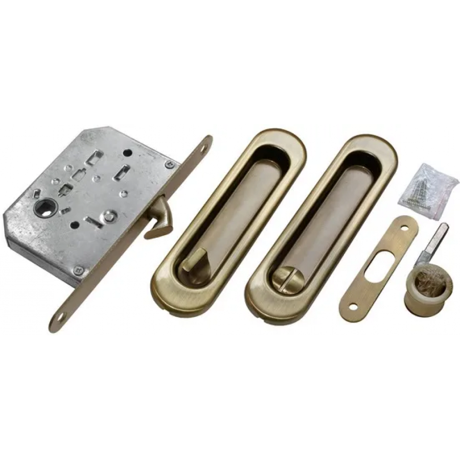 Комплект ручек для раздвижных дверей с механизмом, позволяющим запереть дверь с помощью завертки, или фиксатора.