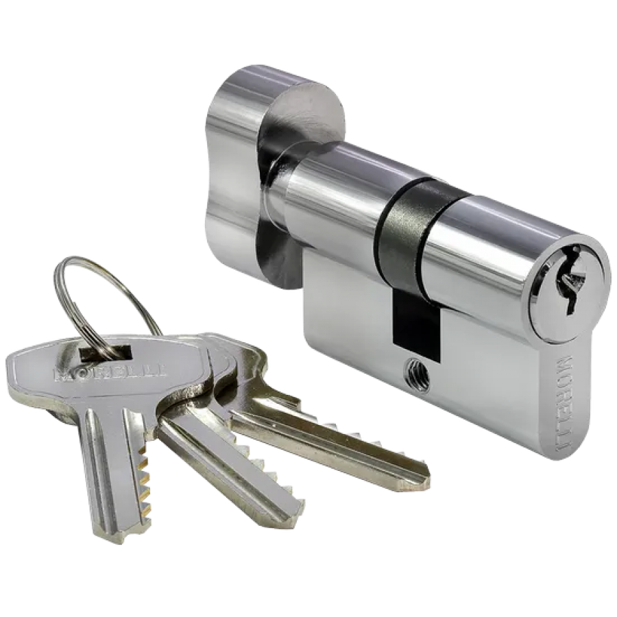 Ключевой цилиндр с заверткой для двери вставляется в замок или защелку для закрытия ключом с одной стороны помещения и поворота кноба с другой.