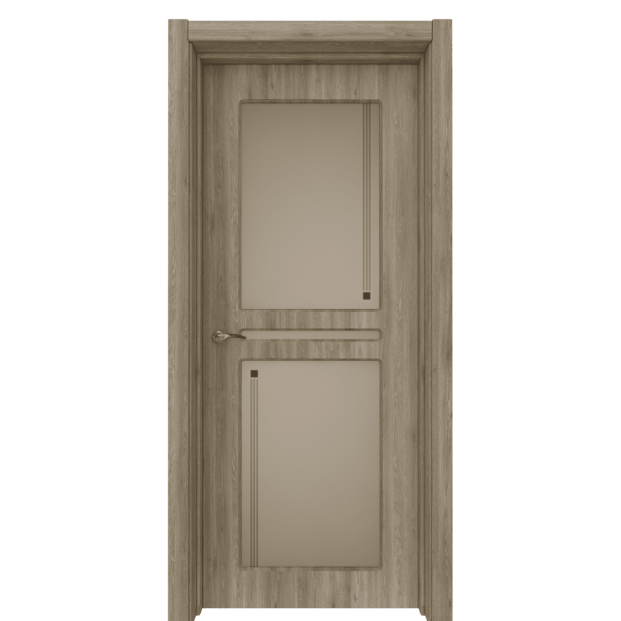 Дверь Натель доступна как без стекла, так и в остекленном варианте. Две большие филенки в соответствии с пожеланиями Клиента могут предстать в виде больших стеклянных вставок. В качестве украшения вставки дополнены рисунком, состоящим из тонких линий и фьюзинга.