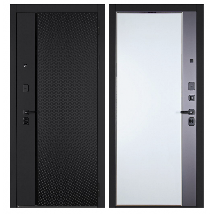 Лист металла 1,5 мм. Экошпонированная панель МДФ 10 мм (цвет «черный кварц»). Объемная фрезеровка. Вертикальная вставка из черного лакобеля. Наличник гладкий, МДФ 80 мм.