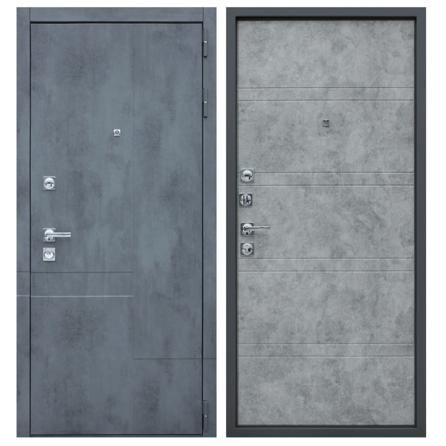 | Внешняя отделка | Лист металла 1,5 мм. Экошпонированная панель МДФ 10 мм. Цвет «бетон темный». Наличник из МДФ 80 мм. Объемная фрезеровка полотна и наличника. |