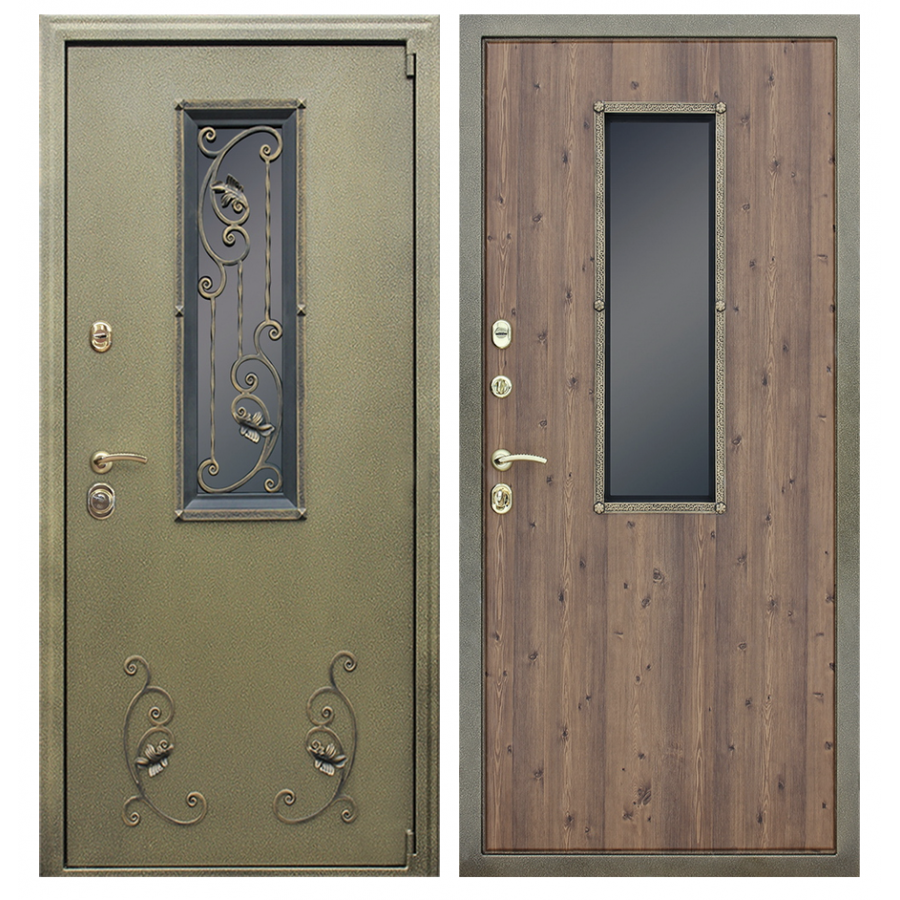 | Внешняя отделка | Лист металла 2 мм. Два слоя покрытия. Тонированный двухкамерный стеклопакет. Декоративная решетка, накладные элементы (художественная ковка). Наличник фигурный. |