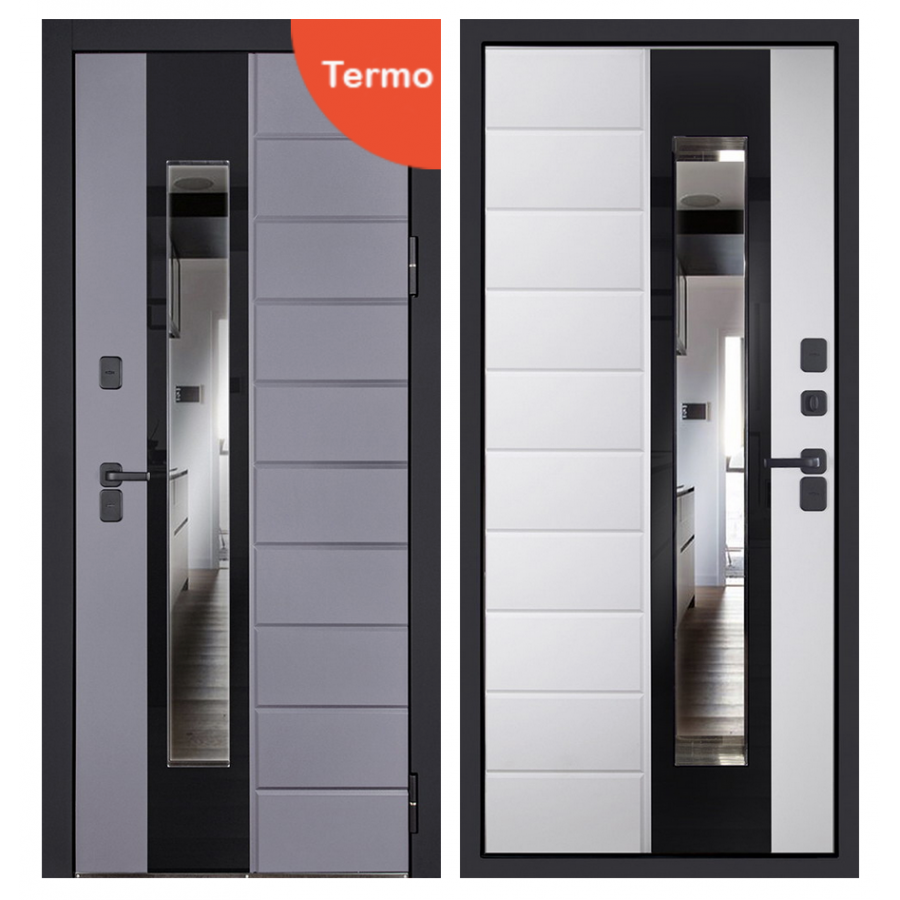 | Внешняя отделка | Лист металла 1,8 мм. Панель МДФ 12мм (цвет "графит софт"). Объемная фрезеровка. Тонированный двухкамерный стеклопакет (цвет "серебро"). Декоративный накладной элемент из черного лакобеля. Наличник МДФ гладкий (цвет "антрацит софт"). |