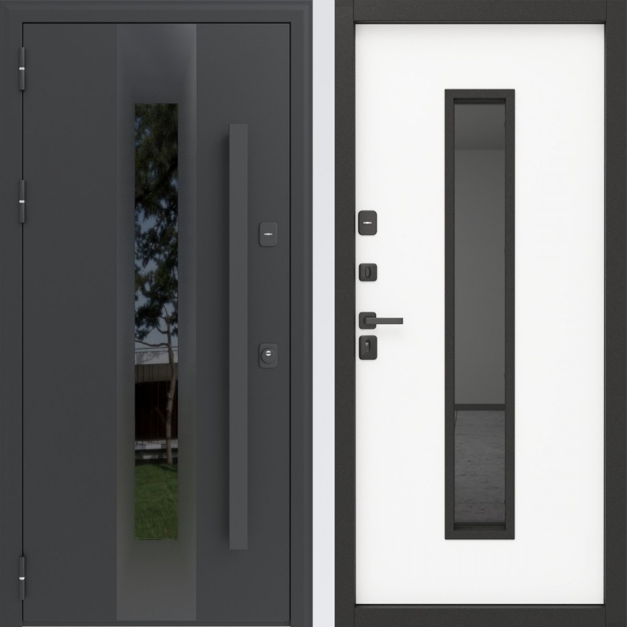 Эта усовершенствованная версия популярной входной двери представляет собой сочетание минимализма, современной фурнитуры и максимальной функциональности. Полностью чёрный цвет total black всех элементов двери подчёркивает премиальный стиль, а новая ручка-скоба с нажимным курком добавляет удобство использования и актуальность решения для входов в частный дом.