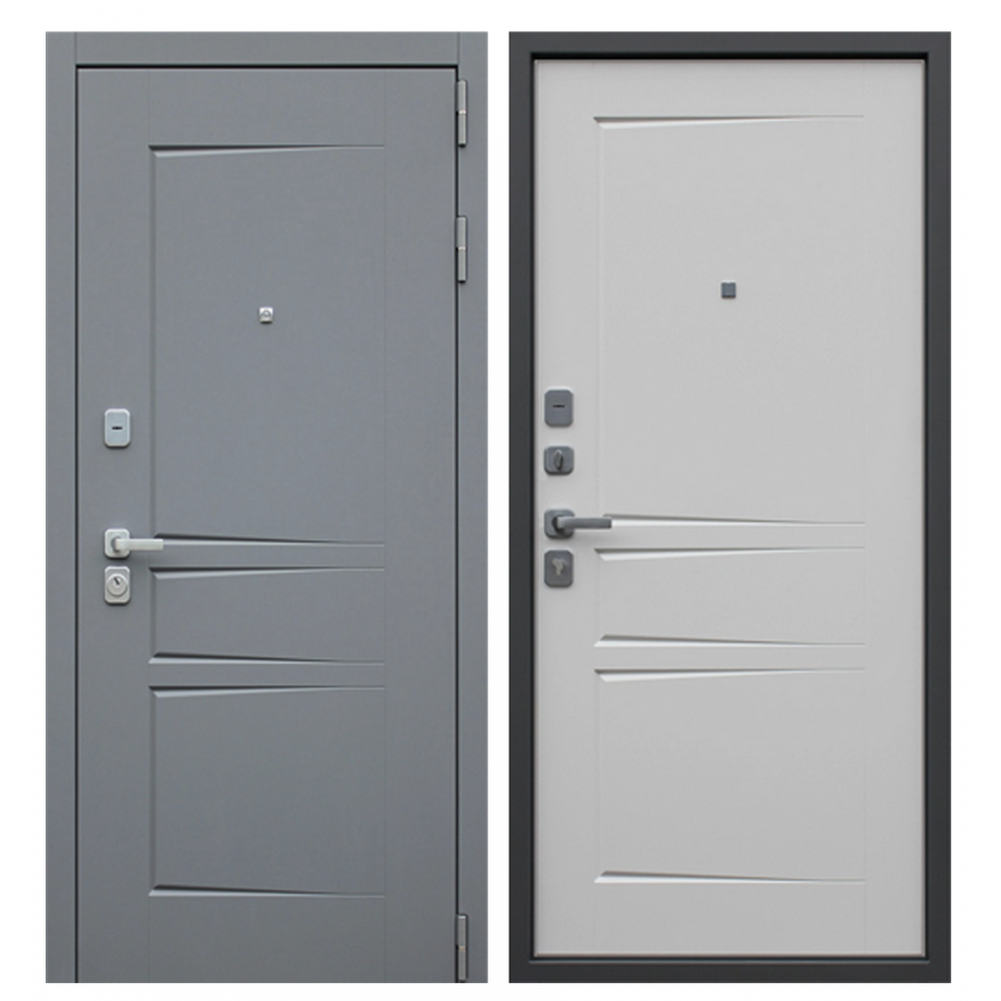 | Внешняя отделка | Лист металла 1,5 мм. Экошпонированная панель МДФ 10 мм. Объемная фрезеровка. Цвет "силк титан". Наличник МДФ 80 мм. |