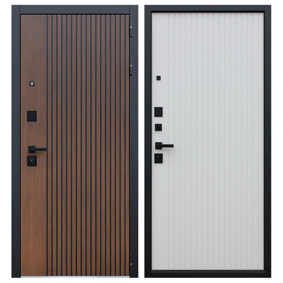 Лист металла 1,5 мм. Экошпонированная дизайнерская панель МДФ 10 мм. Линейная фрезеровка. Цветовая комбинация: "дуб кантри темный", черное патинирование по фрезеровке. Наличник МДФ гладкий 80 мм., цвет "черный кварц".